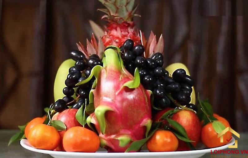 ● Đĩa trái cây: Đi cùng với bình hoa tươi là đĩa trái cây để thể hiện thành ý. Đĩa trái cây đặt bên tay trái đối xứng với lọ hoa tươi. Gia chủ nên thắp hương và thay hoa quả hàng ngày nhất là các ngày mùng 1, ngày rằm và ngày 10 âm hàng tháng.