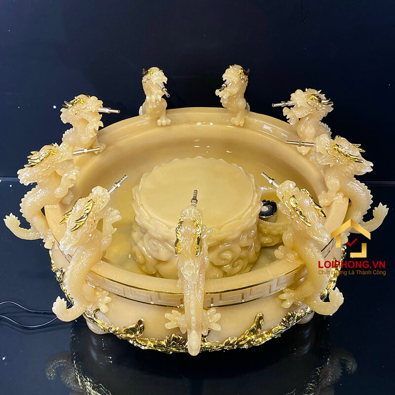 Cấu tạo: Được làm từ bột đá thạch anh màu vàng, thành chậu có hoa sen và cửu long chầu xung quanh bên trong có máy tạo khói sử dụng nguồn điện