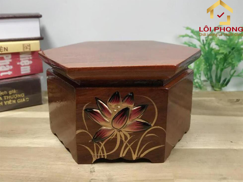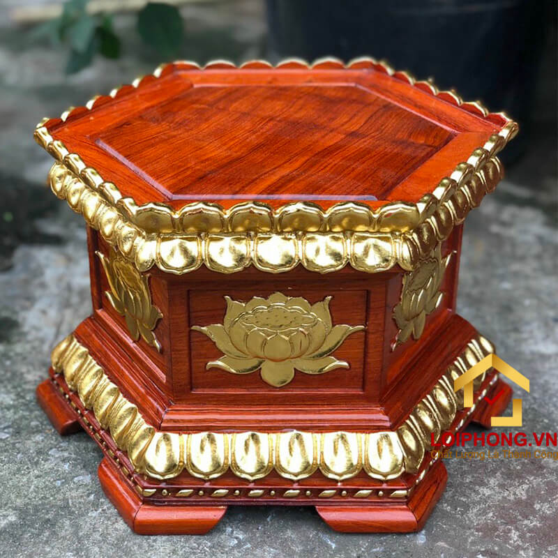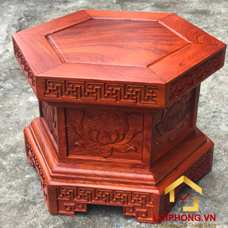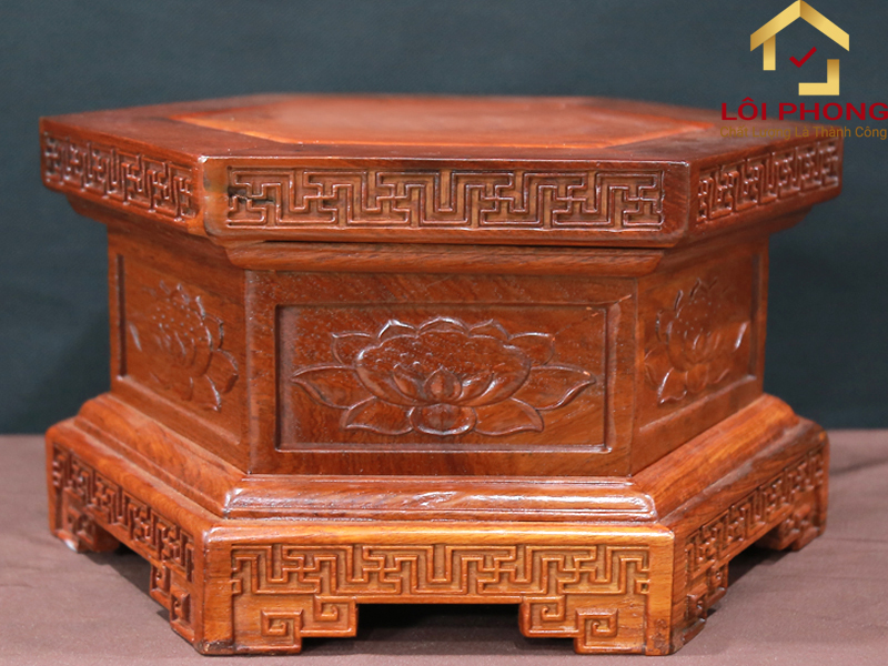 Đôn gỗ lục giác đặt tượng Phật được chạm khắc họa tiết hình hoa sen vô cùng độc đáo. Sản phẩm này chú trọng nhiều đến các đường nét thiết kế giản dị, tinh tế để làm nổi bật hình ảnh tượng Phật cao quý khi được kê ở bên trên.