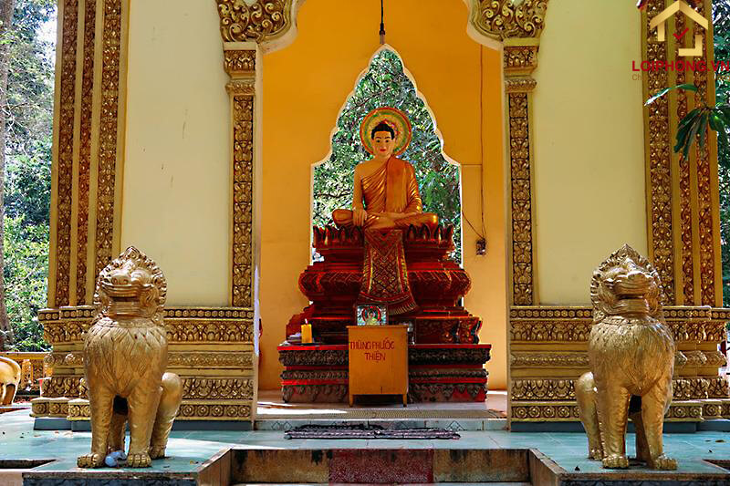 Đi sâu vào khu vực chánh điện bạn sẽ thấy pho tượng Phật Thích Ca bằng đá nguyên khối, đặt trên một tòa sen cao khoảng 2 mét. Ấn tượng không kém đó là pho tượng được miêu tả là Đức Phật cưỡi trên rắn thần Muchalinda.