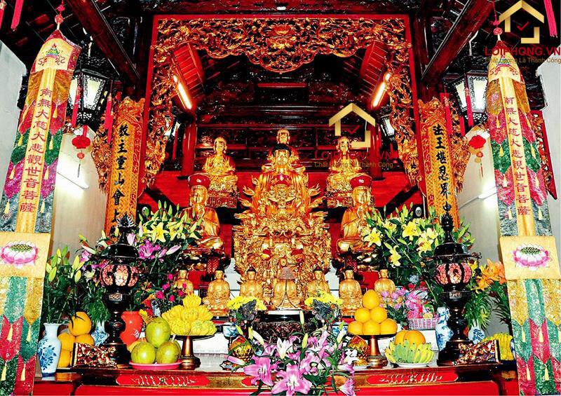 Bên trong đại điện thờ Phật Thích Ca Mâu Ni và Phật Quan Thế Âm Bồ Tát cùng các vị A La Hán. Chính giữa đại điện là tượng Phật Thích Ca Mô Ni cao khoảng 7 mét, nụ cười từ bi. Hai bên tượng Phật Thích Ca Mô Ni còn thờ 10 bức tượng Thập Điện Diêm Vương được điêu khắc từ gỗ, cao 0,64 mét. Các vật dụng trong chùa đều được làm từ gốm sứ, đúc rất tinh xảo và công phu.