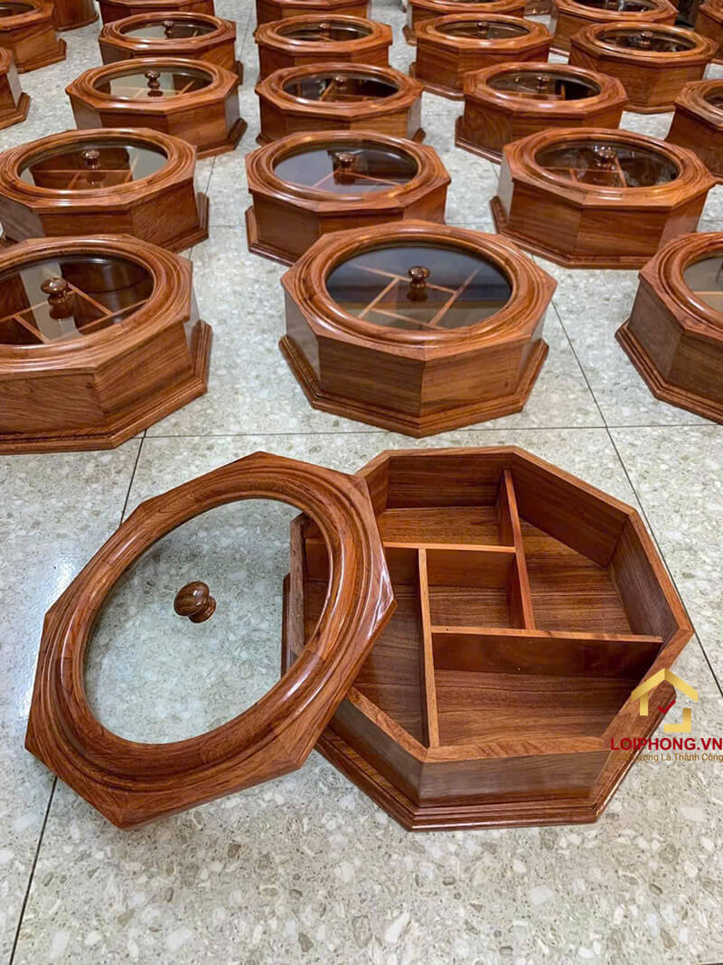 Được làm bằng chất liệu gỗ hương độc đáo, lại kết hợp phương pháp sản xuất cầu kỳ, nên hộp đựng mứt Tết bằng gỗ thật càng tăng thêm sự đặc biệt cho chính nó. Không chỉ phù hợp để làm món đồ trưng Tết, hộp đựng mứt Tết bằng gỗ này còn phù hợp để làm quà tặng, biếu.