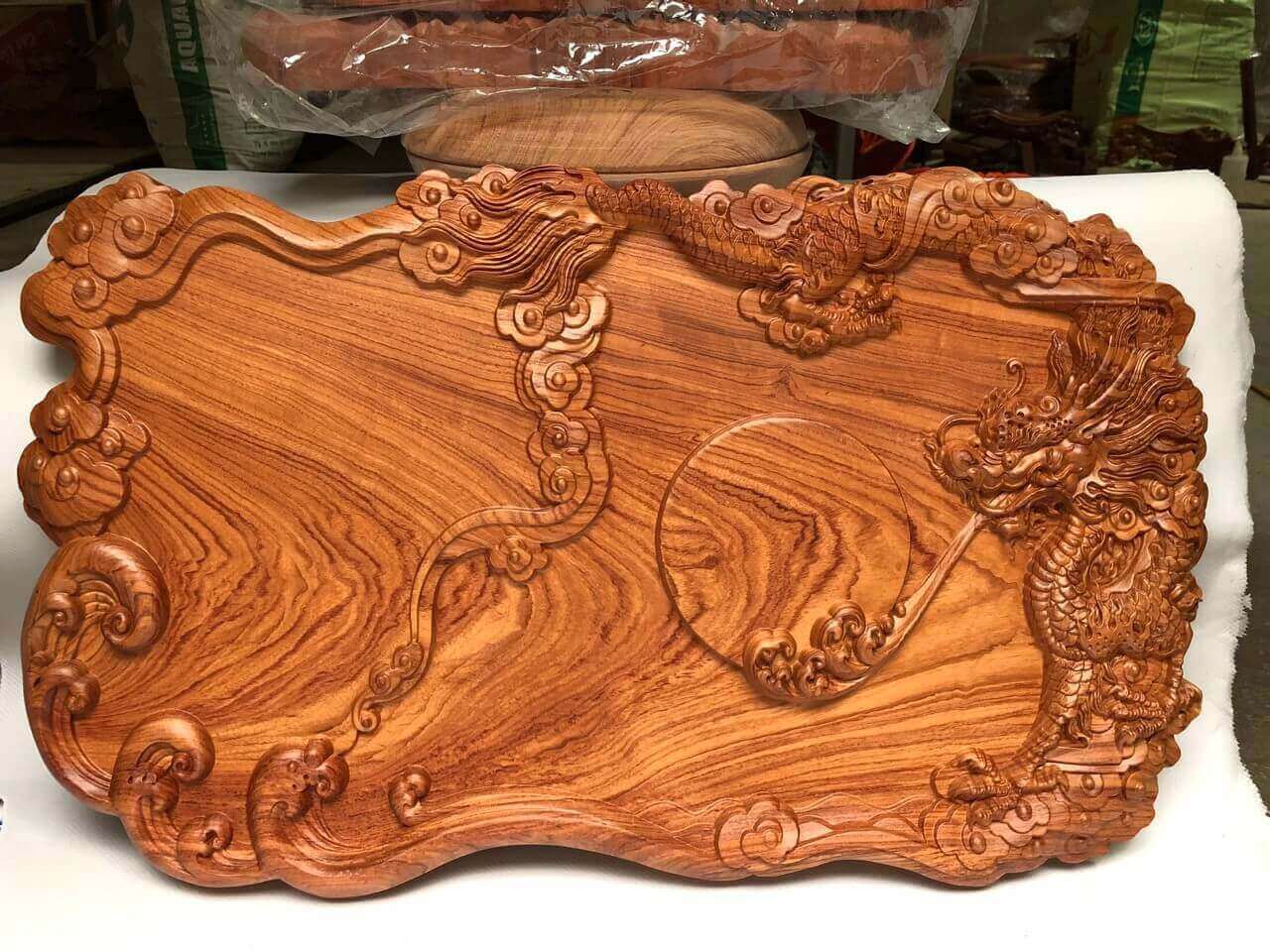 Gỗ hương là loại gỗ chất lượng tốt và có mùi hương đặc biệt. Trong mỗi thớ gỗ đều có chứa những túi tinh dầu nhỏ, tạo mùi hương sang trọng. Khay trà được các nghệ nhân tạo các đường bo viền trơn mịn mang tới cảm giác tinh tế. Khay trà gỗ hương hiện có các kích thước 74x40x13cm, 35x55x4cm với thiết kế ngũ long hoặc kỳ đà chắc chắn sẽ tạo điểm nhấn nổi bật cho phòng khách.