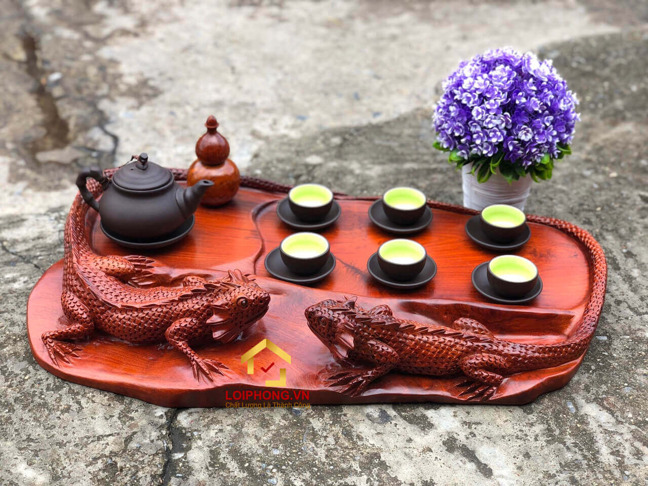 Khay trà gỗ nguyên khối chạm khắc kỳ nhông rất đẹp
