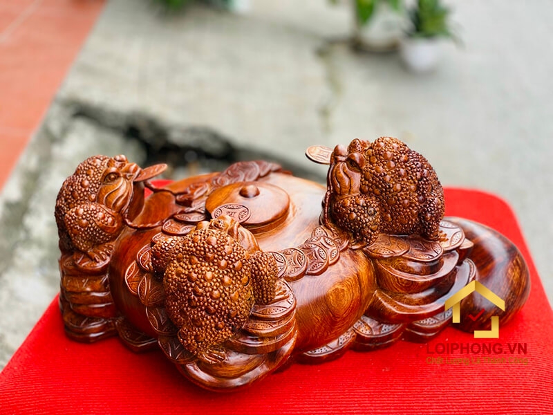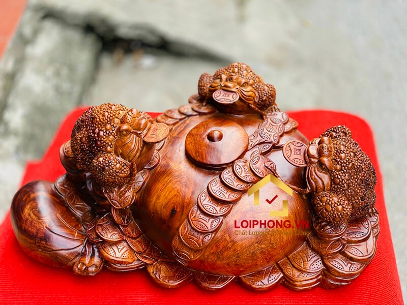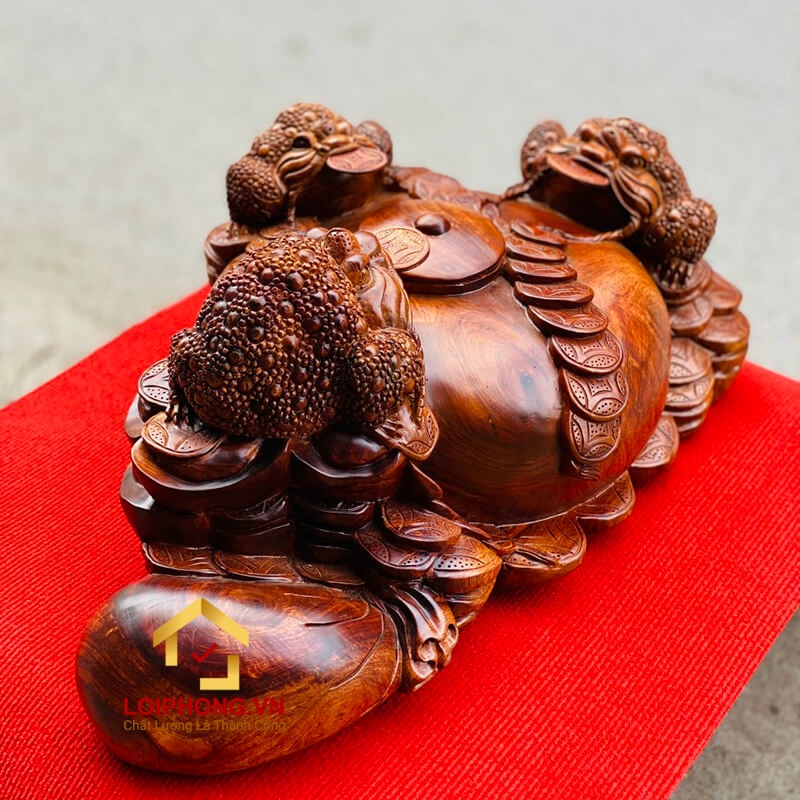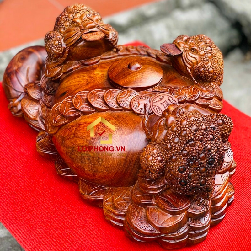 Tam cóc ngậm tiền tài lộc trấn giữ hũ tiền bằng gỗ hương kích thước ngang 75 cm x sâu 42 cm x cao 30 cm