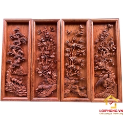 Tranh Tứ Quý gỗ đẹp bằng gỗ hương đá kích thước Rộng 37 x dài 117 x dày 5 cm giúp cầu tài, cầu lộc, may mắn, sung túc, thịnh vượng cho gia chủ