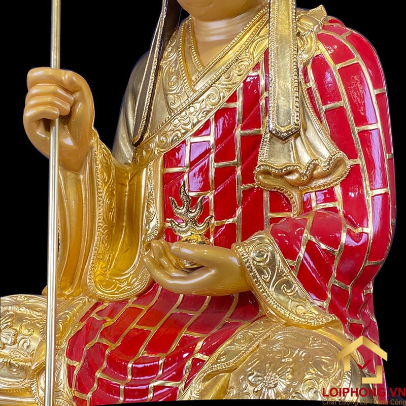- Thiết kế tinh xảo: Tượng Địa Tạng Vương Bồ Tát ngồi trên đài sen trong tư thế trang nghiêm, tay cầm tịch trượng và bảo châu, mang ý nghĩa giác ngộ, đại diện cho trí tuệ và sự khai sáng, làm nổi bật vẻ đẹp truyền thống và hiện đại.