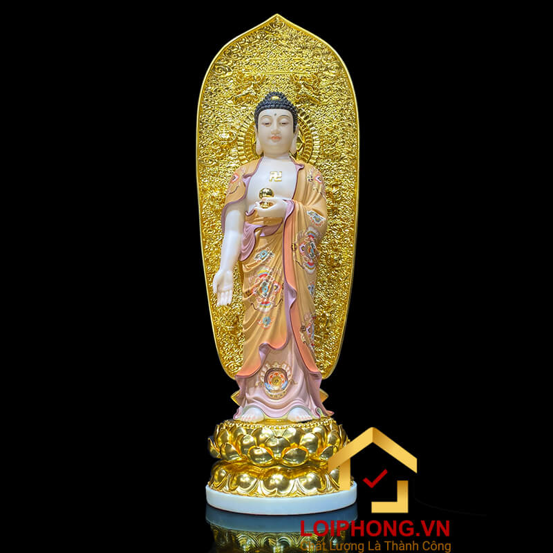 Tượng phật A Di Đà đứng đài sen bằng bột đá vẽ gấm có lá đề dát vàng 998