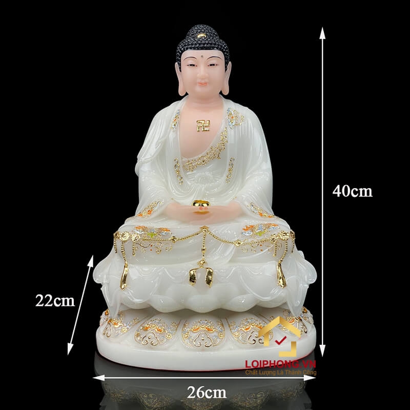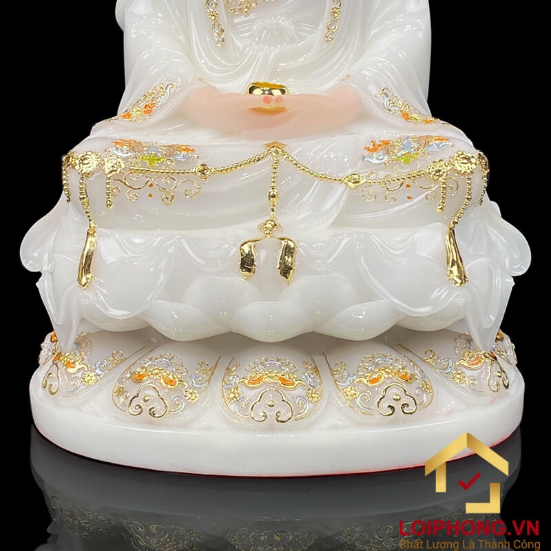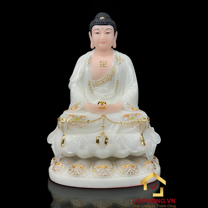 Tượng Phật A Di Đà Ngồi Đế Hoa Sen Bằng Bột Đá Trắng Viền Vàng cao 30 - 65cm – Biểu Tượng Của Bình An Và Từ Bi
