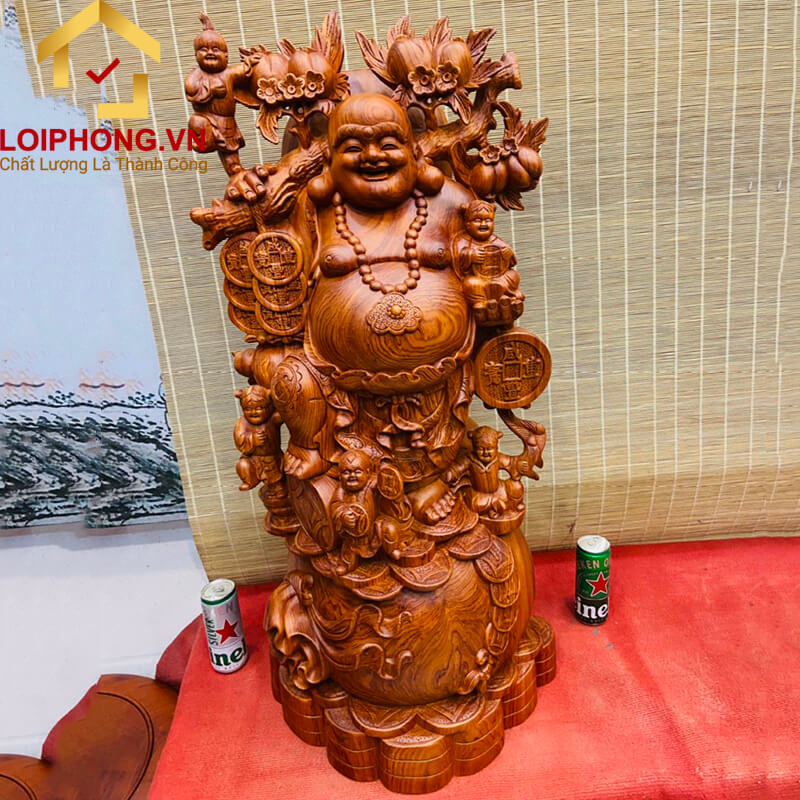 Tượng Phật Di Lặc ngũ phúc gánh đào 100x46x42 cm cao cấp bằng gỗ hương này phù hợp với mọi lứa tuổi gia chủ