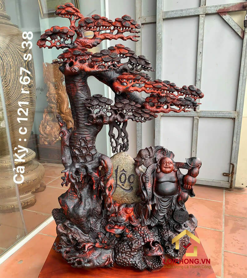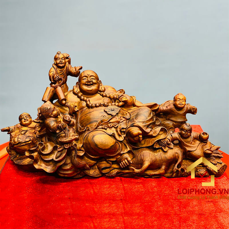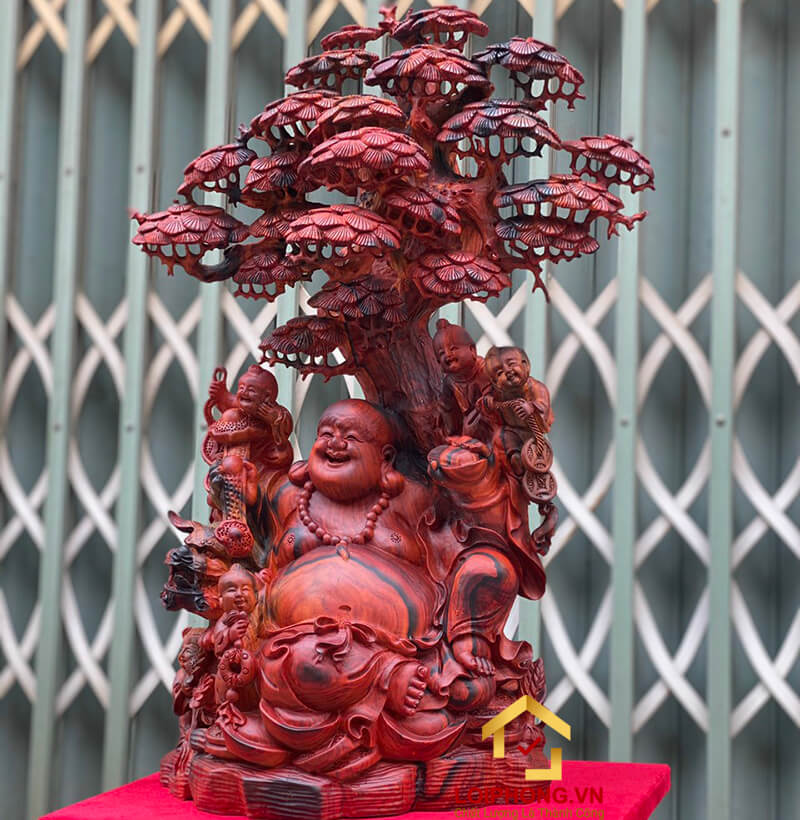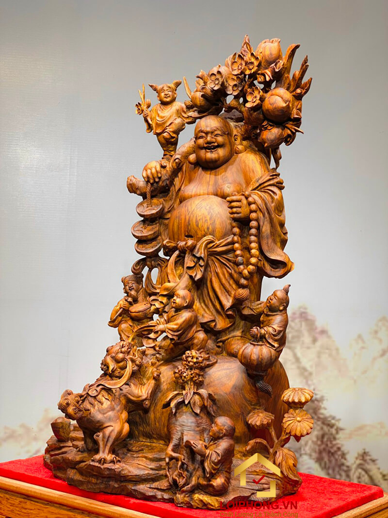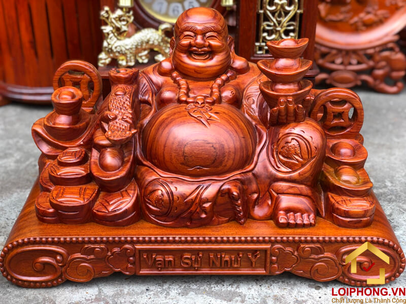 Sử dụng loại gỗ hương đá khắc họa lên hình ảnh tượng Phật Di Lặc ngồi cùng tài lộc với khuôn mặt phúc hậu, vác cây như ý, vô cùng độc đáo và đẹp mắt. Thể hiện sự may mắn về tiền bạc, của cải trong cuộc sống.