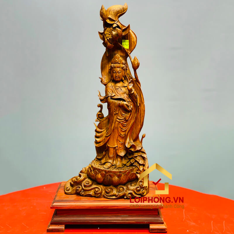 Tượng Phật Quan Âm đứng đài sen 53x24x16 cm cao cấp bằng gỗ hương này phù hợp với mọi lứa tuổi gia chủ