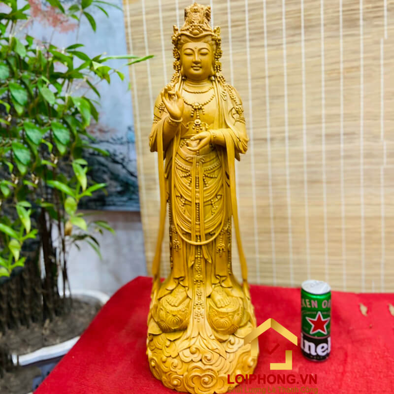 Tượng Phật Quan Âm đứng đài sen 70x23x21 cm cao cấp bằng gỗ gõ vàng này phù hợp với mọi lứa tuổi gia chủ