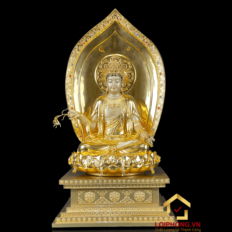 Tượng Phật Quan Âm ngồi đế kim cang bằng đồng dát vàng cao 65-91 cm từ bi, hiền hậu từ dung nhan, thần thái của Quan Âm Bồ Tát chính là yếu tố giúp lòng người cảm thấy bình an, yên tâm