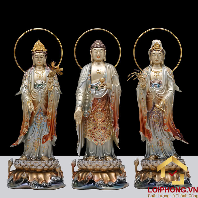 Tượng phật Tây Phương Tam Thánh bằng đồng men sơn bạc ấn bảo cao 48 – 65 – 90 – 106 cm