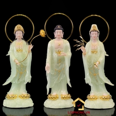 Tượng Phật Tây Phương Tam Thánh Đứng Đài Sen Bằng Bột Đá Thạch Ngọc Có Hào Quang cao từ 48 - 90cm là sự kết hợp giữa tinh xảo và vẻ đẹp tâm linh,mang đến sự uy nghi và linh thiêng cho không gian thờ cúng