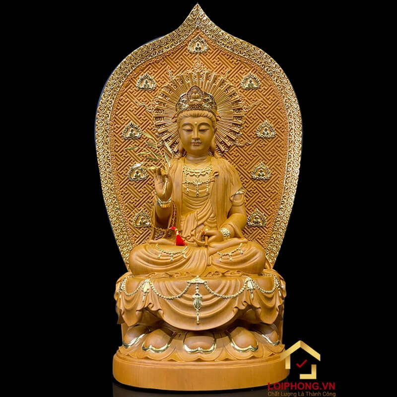 - Lá đề thiết kế độc đáo: Được khắc họa tinh tế phía sau tượng, tượng trưng cho sự giác ngộ và bảo hộ, tạo điểm nhấn ấn tượng cho bộ tượng.