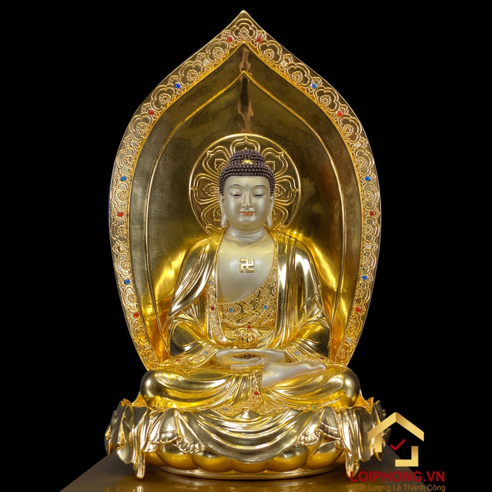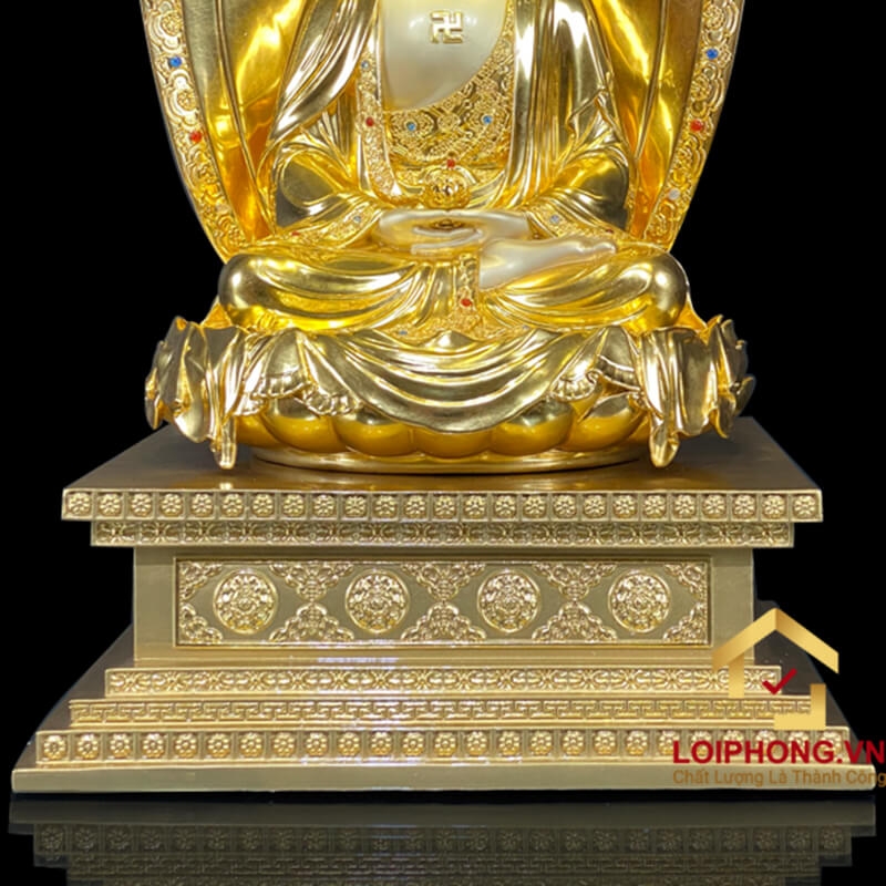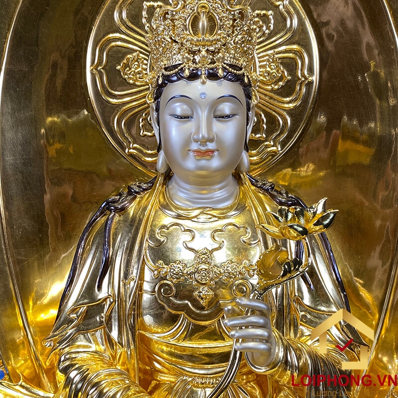 - Dát vàng thủ công sang trọng: Các chi tiết dát vàng được chế tác thủ công,tạo điểm nhấn,tôn lên sự uy nghi và linh thiêng cho bộ tượng