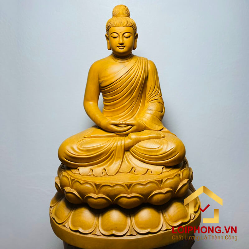 Tượng Phật Thích Ca tĩnh tâm 90x66x55 cm cao cấp bằng gỗ gõ vàng này phù hợp với mọi lứa tuổi gia chủ