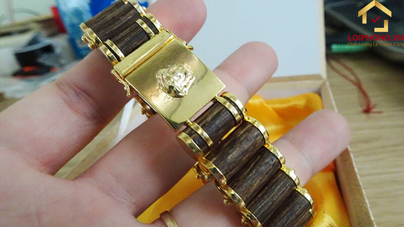 Vòng tay Trầm Hương bọc vàng kiểu dáng dây đồng hồ được chạm khắc chắn chắn và tinh xảo